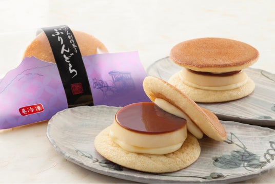 阿蘇小国・ジャージー牛乳入りのコく深いプリンに、ほろ苦いカラメルソースでアクセント。ふんわりパンケーキ風のどら焼きで、カスタードクリームとあわせてサンド!