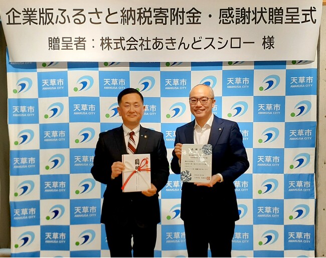 株式会社FOOD & LIFE COMPANIES(本社:大阪府吹田市、代表取締役社長 CEO:水留 浩一、以下 F&LC)の子会社である株式会社あきんどスシロー(本社:大阪府吹田市、代表取締役社長:新居 耕平)は、2023年9月15日に熊本県天草市へ企業版ふるさと納税による寄付を行いました。そしてこの度、2024年1月15日に感謝状をいただきましたのでお知らせします。