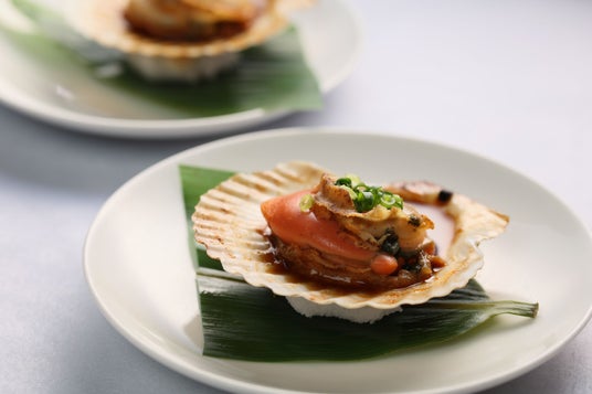 さらに、テーブルサービスとしてお一人様におひとつ、ランチタイムでは「帆立貝のオーブン焼き」、ディナータイムには「トゲズワイガニ 500g、お造り、帆立貝オーブン焼きの盛合わせプレート」をご提供いたします。