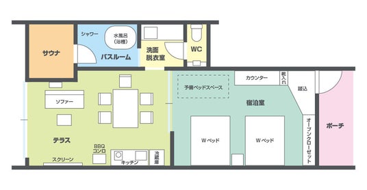 宿泊棟は全9棟コテージタイプ。プライベート空間で、あなたとあなたの大切な人たちとのかけがえのない時間を思いっきり味わってください。