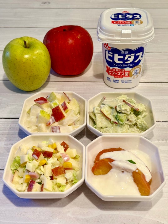 「食のおいしさ・楽しさ」と「健康・栄養」の両立を目指す森永乳業は、「全ての人たちが健康で豊かに長生きできること」を目指す青森県の健康への想いに共感し、当社の「ビヒダス ヨーグルト」と「青森りんご」の相性の良さに着目することで貢献できるのではと考え、今回のコラボレーションの実現に至りました。 今回の腸活応援コラボメニューに使用している「ビヒダス プレーンヨーグルト」は特定保健用食品であり、生きた『ビフィズス菌 BB536』を含んでいますので、腸内のビフィズス菌が増え、腸内環境を良好にし、おなかの調子を整えます。また、青森りんごに含まれる食物繊維はビフィズス菌など善玉菌のエサとなるため、「ビヒダス ヨーグルト」と「青森りんご」は相性抜群で、おなかにうれしい組み合わせです。 本コラボ企画では、全4種類の週替わりで、各メニューを数量限定でご用意しています。当社Webサイト上の特集ページでも青森県庁食堂で提供するコラボメニューの一部を含め、様々なコラボレシピを公開しています。毎日のお食事やおやつに、「ビヒダス ヨーグルト」と「青森りんご」を取り入れてみてください。