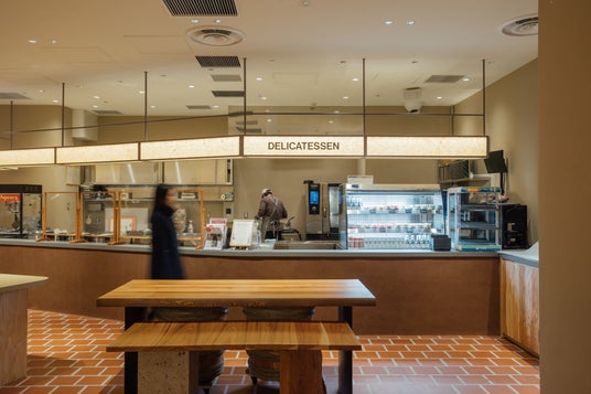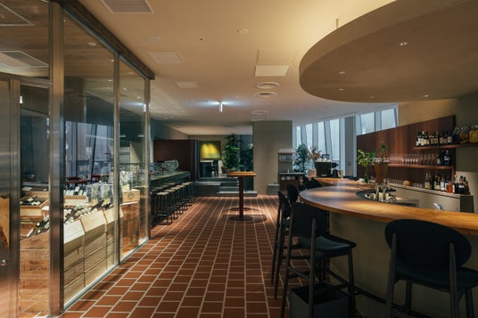 当店のインテリアデザインは「Common(東京・六本木)」や「Soil Setoda(広島・尾道)」を手掛けたデザインユニットSTUDIO DIG.が担当。店内の床材はテラコッタのタイルを敷き、レジカウンター等を左官職人が手作業で仕上げるなど”手触り感”を演出しつつ、再利用した木材や石材を什器の土台に採用してサステナビリティを意識したデザインに。また空間全体を通して土や木、石、和紙などの自然素材を用いることで、素材にこだわる信濃屋の姿勢を表現しています。レストランエリアは、バーカウンター席、デリコーナー、テーブル席といった機能ごとに異なる楽しみ方ができるようにレイアウト。それらの空間を流動的に繋ぐことで、フードマーケットエリアから視覚的にも連帯感を生むように意図されています。