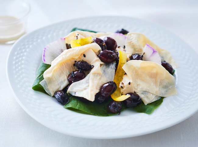 ふっくら大きな京都の黒豆、「新丹波黒」を甘く炊き上げました。クリーミーな生湯葉、豆腐、香り豊かな黒ごまが好相性。そんな京の味わいを洋の風味で引き立てる、旨み豊かな「クリームチーズソース」とご一緒に。