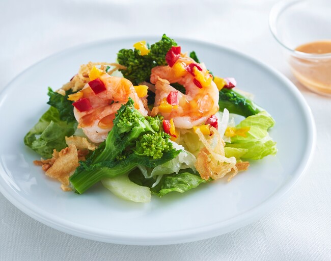 ほろ苦さがクセになる京野菜「花菜」を、香ばしいグリル海老とご一緒に。フライドオニオンやピーナッツの旨みがアクセント。食欲をそそる「だし香る焙煎胡麻マヨソース」をかけて、お召し上がりください。