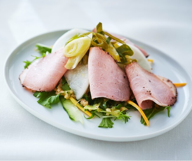 京野菜「九条ねぎ」と黒胡椒ハムのサラダ 旨塩レモンだれ ¥497(100g)