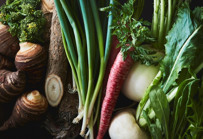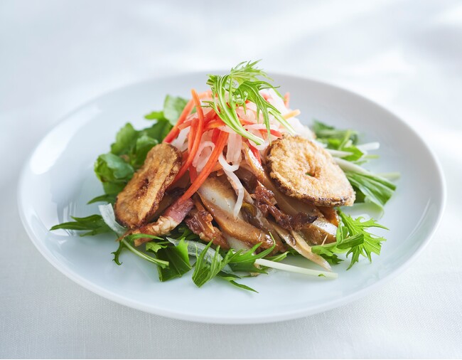 柔らかく風味豊かな京野菜「堀川ごぼう」を2つの調理法で。バルサミコ酢に醤油をあわせ、洋風のきんぴらに仕立てたごぼうと、輪切りを柔らかく揚げたごぼうの味わいを楽しめます。聖護院大根と金時人参で彩りを、ベーコンや玉ねぎで味に深みを出しました。せりと柚子の香りも効いています。