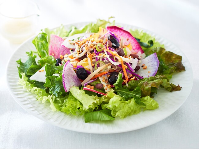 聖護院かぶら、堀川ごぼう、京たけのこなどの京野菜を加えた30品目サラダです。定番の「和風ガーリックドレッシング」、またはこの時期限定の「塩麹と千鳥酢のドレッシング」でお楽しみください。
