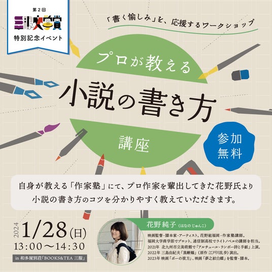 2024年1月22日(月)より募集が始まる「第2回三服文学賞」ですが、多くの方にご応募いただくために、多彩なゲストをお招きした“書く“を応援するイベントを「BOOKS&TEA 三服(さんぷく)」で実施いたします。第2弾のイベントは「プロが教える、小説の書き方講座」です。自身が教える「作家塾」にて、プロ作家を輩出してきた花野純子さんより、小説の書き方のコツを分かりやすく教えていただきます。小説を書いたことがない方でも、書くことへの興味があれば大丈夫。実際に、”書く時間”も講義の中に取り入れ、受講者全員で書いているライブ感を楽しみながら小説を書き上げる講座です。