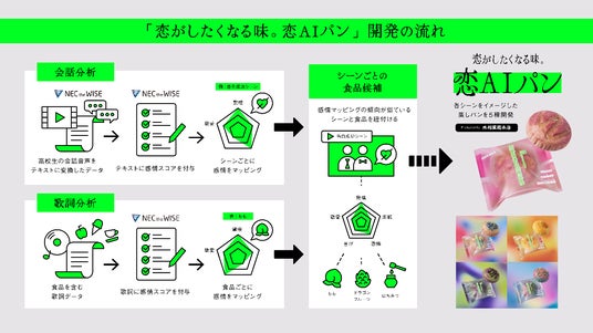 株式会社木村屋總本店(注1、以下 木村屋)と日本電気株式会社(注2、以下 NEC)は、株式会社Abema TV(注3、以下 ABEMA)の恋愛番組「今日、好きになりました。」の参加者の会話と、フルーツやスイーツが登場する曲の歌詞(注4)をNECのAIで分析し、恋愛感情と食品を紐づけて味を表現した「恋AIパン」5種を開発しました。木村屋は、2024年2月1日(木)から関東近郊のスーパー、木村屋の直営店やオンラインショップにて順次販売を開始します。