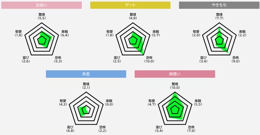 - 「NEC the WISE」のデータ意味理解技術を活用した「NEC Data Enrichment」(注9)を用い、出会いや告白、初めてのデートといった、恋愛シーンごとの会話文に32個の感情ワードとの相関を表した感情スコアを付与し、恋愛シーンごとの感情の傾向を可視化。