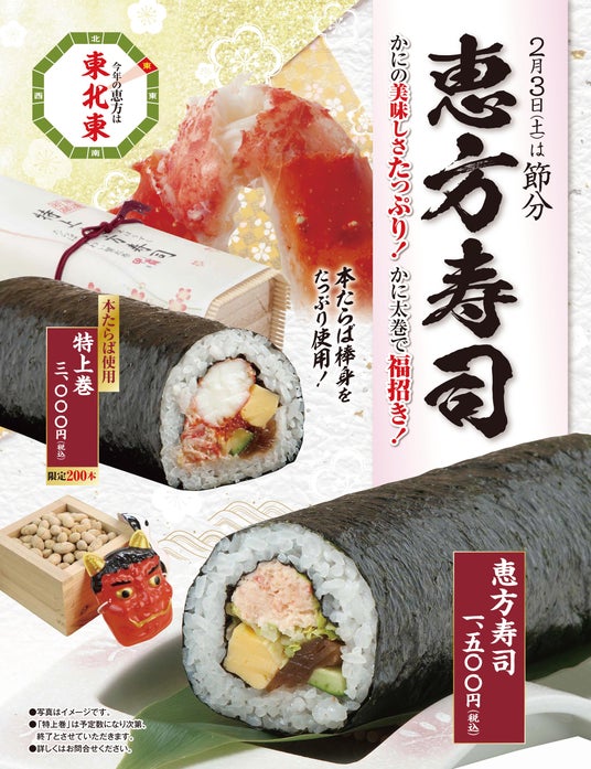 株式会社甲羅(本社:愛知県豊橋市、代表取締役:坂元 正明)が全国で40店舗展開している老舗かに料理専門店「甲羅本店」では、今年も2月3日(土)の節分にあわせてご家庭用に「恵方寿司」の注文を受け付けています。本たらばをたっぷり使用した「特上巻」は各店200本の数量限定となるのでご予約はお早めに。