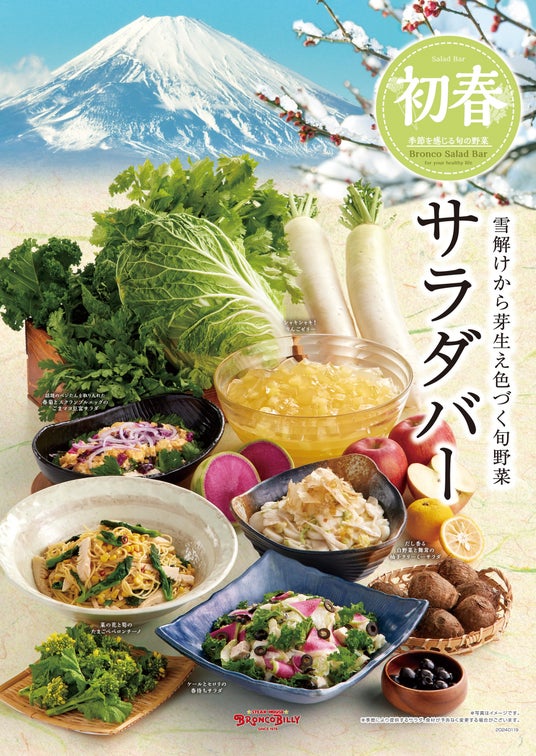 - 選べるこだわりのセットメニューで、『初春サラダバー』をお楽しみいただけます!【ランチメニュー】 ・ランチメニューにプラス460円(税込506円)・サラダバーのみお楽しみいただける 単品サラダバー1,080円(税込1,188円)※ランチメニューには、メイン・魚沼産コシヒカリ大かまどごはん(又はパン)・たまごスープが付きます。※一部、新鮮サラダバーも含む、おトクなセットメニューもご用意しております。※ランチメニュー詳細:https://www.bronco.co.jp/menu/cat/lunch/