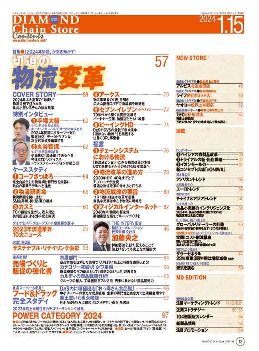 ●識者提言このほか、今号のThe Interviewには、「焼肉きんぐ」など国内外で17の外食ブランドを展開する物語コーポレーション(愛知県)の加藤央之社長が登場。新フォーマットを続々開発しながら勢力を拡大する同社の戦略について聞きました。さらに、年始恒例の「2023年流通業界10大ニュース」を今年も発表。23年の業界の動きを振り返りつつ、今年の行方を占います。今号も盛りだくさんの内容でお送りしますので、ぜひご購読のほどよろしくお願いします!