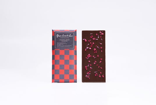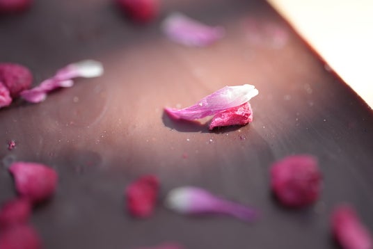 ベースとなるマダガスカル産のチョコレートは、優しい酸味が赤いフルーツとシトラスの爽やかさを連想させる。そこにフランボワーズの酸味、ローズヒップの甘い香りと酸味が相乗し、味わいが幾重にも重なるビーントゥバーらしい一枚。