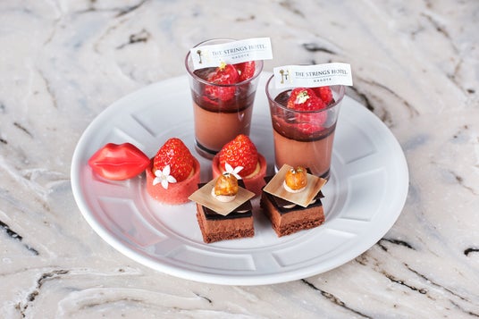 旬のいちごと2種類のプレミアムチョコレートが織りなす、リッチなスイーツ7種類に加え、フォアグラとアマレーナチェリーのムース、グリーンオリーブと竹炭のフリットや、エビマリネとタラモサラダのブリニなど特製セイボリー3種類をご用意。