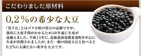黒千石とはゴク小粒の黒前の品種ですが、栽培に大変手間がかかるため、約30年前に生産が途絶えました。平成13年に北海道雨竜北竜町を中心に再開されましたが、まだ一般の大豆に比べると0.2%にも満たない希少な大豆です。
