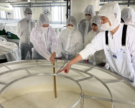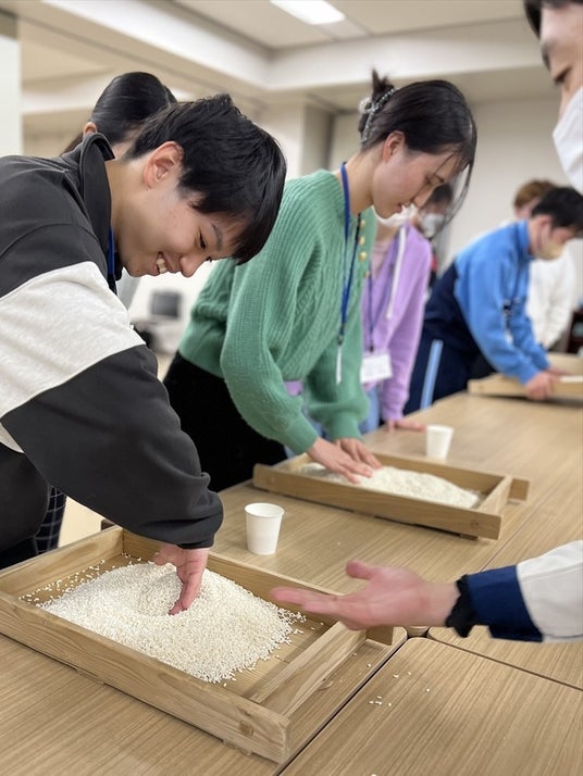 大学生たちは、当社社員による日本酒の造り方や灘五郷に関する講義の後、本店二号蔵で酒造りの現場を見学し、山田錦(田植え・稲刈りをした吉川町南水上地区産)の洗米やもろみの発酵タンクの櫂入れを体験しました。この体験を通じ、酒造りの奥深さや大変さを身に染みて感じることが出来たようです。