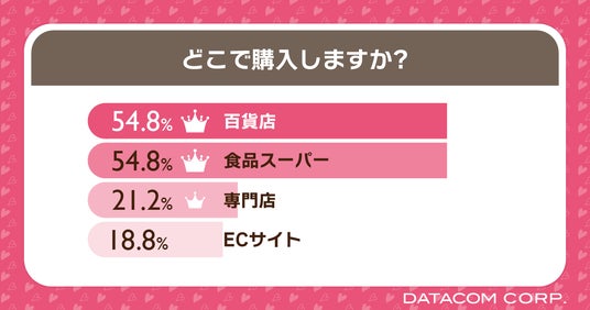 バレンタインデーのお菓子の購入場所(複数回答可)については、「百貨店」と「食品スーパー」が54.8%で同率1位に。