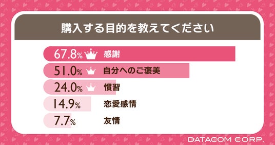 バレンタインデーにお菓子を購入する目的(複数回答可)を聞いたところ、1位の「感謝」が67.8%、2位の「自分へのご褒美」が51.0%と回答者の半数以上がこの2つの目的で購入していることが分かりました。
