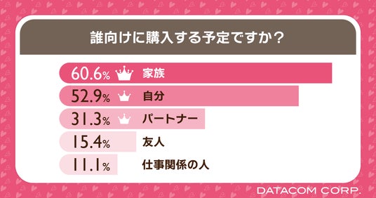 3位以降は「パートナー」31.3%、「友人」15.4%、「仕事関係の人」11.1%となり、現在のトレンドである自分や家族向けの購入が多いという傾向が現れました。