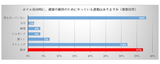 調査の結果、普段から健康に気を付けている方が60%以上であり、もっとも多い1日あたりの歩数は4,000歩以上6,000歩未満でした。また、ホテル宿泊時に最も行っている運動は「散歩」でした。