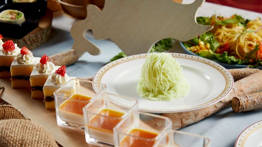 また、『羅臼産タコの頭と野菜のアヒージョ』や『函館がごめ昆布と白身魚のポン酢ゼリー』など、北海道の食材をふんだんに使用したメニューがブッフェボードに並びます。更に、『襟裳産「さめかれい」のザンギ』より、通常では廃棄しがちな“骨”を再利用した『襟裳産「さめかれい」の骨せんべい』*もご用意。食材を余すことなくシェフがアレンジしたメニューをお楽しみいただけます。