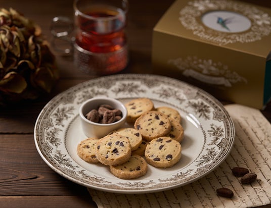 カカオバニーユは、ブルボンバニラの香りを最大限引き出す配合にこだわったディアマンバニーユに、チョコレートチップ、カカオニブの香りと食感を加えた、よりリッチなクッキーです。カカオニブとは、カカオ豆をローストして細かく砕き、余分な皮などを取り除いたチョコレートになる前の原料で、カカオの香りをダイレクトに感じることができます。
