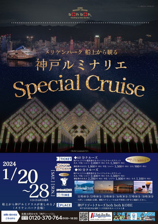 今回特別に神戸ルミナリエ特別鑑賞券付プレミアムクルーズチケットは17:00、18:30便にて各20名様限定にて販売させて頂きます。先着予約を承りますのでご希望される場合はお早めに神戸シーバスまでご連絡をお願いします。
