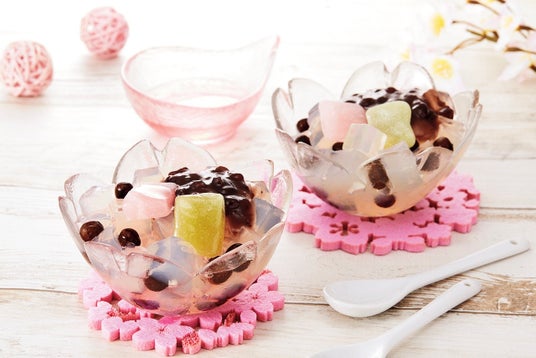墨田区向島で昭和12年から美味しさを追求し続けている柳澤商店の自信作。春の季節限定商品で、伊豆半島産の天草を使用したこだわり寒天の桜あんみつです。伊豆半島産の天草を昔ながらの開放釜製法でじっくりと炊き上げた寒天に、桜みつ、求肥、小倉餡をのせてお召し上がりください。
