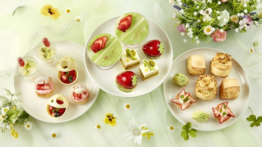 今回は、「スプリングガーデン」をテーマに、ライトグリーン・レッド・ホワイトのカラーで統一し、春に咲き誇る花や新芽をイメージしたアフタヌーンティーをご用意いたしました。