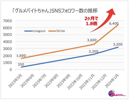 サービスを開始した2023年5月から、動画投稿数の増加に伴い、グルメバイトちゃんのSNSフォロワー数は順調に増加。直近2ヶ月においては、50万以上の再生回数の投稿動画が5本、中には100万再生越えの動画も出現。多くの方にご覧いただけたこともあり、TikTokフォロワー数は直近2ヶ月で約1.8倍、Instagramは約1.4倍に伸びています。