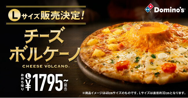 1月9日(火)より販売中の「チーズボルケーノ(TM)」は、インパクト抜群な見た目や、やみつきになるチーズの濃厚な味わいが話題を呼び、発売以来多くのご好評の声をいただいています。一方で、直径40cmの特大サイズであるニューヨーカーサイズのみの展開だったため、気にはなっているものの、チャレンジするハードルが高いとのお声をいただいていました。そんなお客様の声にお応えするべく、このたびドミノ・ピザでは、「チーズボルケーノ(TM)」の発売10日目にして、新たなサイズとして「Lサイズ」を急遽ご用意し、1月19日(金)から2月18日(日)まで期間限定で販売します。