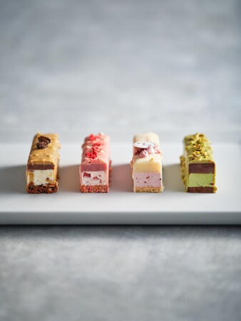 ショコラをしっかりと感じるブラウニーに、芳醇な香りのピスタチオのガナッシュを重ね、