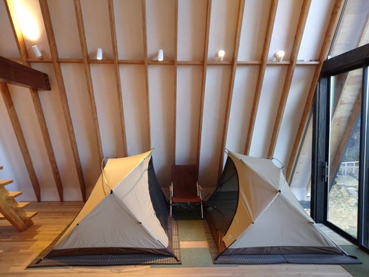 一棟貸の宿泊棟で、室内はセルフビルドで漆喰仕上げにしています。ロフトがある秘密基地のような建物の中で、こどもはワクワク、親はゆったり過ごすことができます。