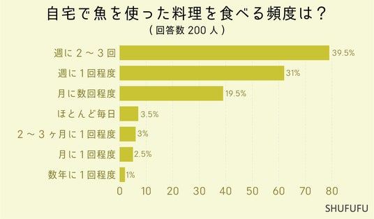「自宅で魚を使った料理を食べる頻度は?」との問いに対して最も多かった回答は「週に2~3回(39.5%)」で、次いで多かった回答は「週に1回程度(31%)」という結果でした。