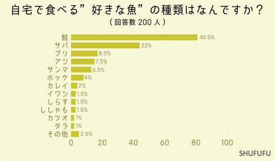200人に自宅で魚を使った料理に関するアンケート調査を行った所、70%以上の人が1週間に1回以上自宅で魚を使った料理を食べていることがわかりました。また好んで食べられている魚は「鮭」が圧倒的な1位となり、「サバ」「ブリ」と続いていました。