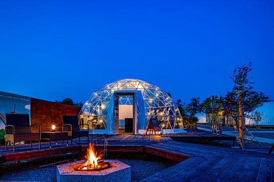 共有スペースには焚き火スペースと透明ドームでのセルフサービスのナイトバーを設置。