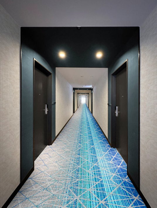 客室は旅の心を癒す、心落ち着く翠をベースにした柔らかな色合いで全体を構成します。さらに、フロア全体で京らしさを感じていただけるよう、廊下には鴨川を模した涼やかな水色の絨毯と、「京都五色」をイメージしたアートを配置しました。