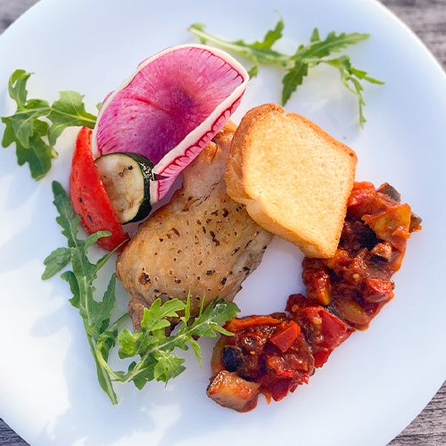 ・骨付き鶏腿肉のコンフィ カレー風味のラタトゥイユと共に
