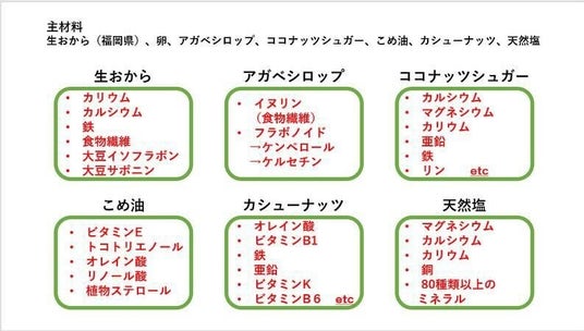 上記は、「おから100%ケーキ」の主原料・成分と、その成分効果。