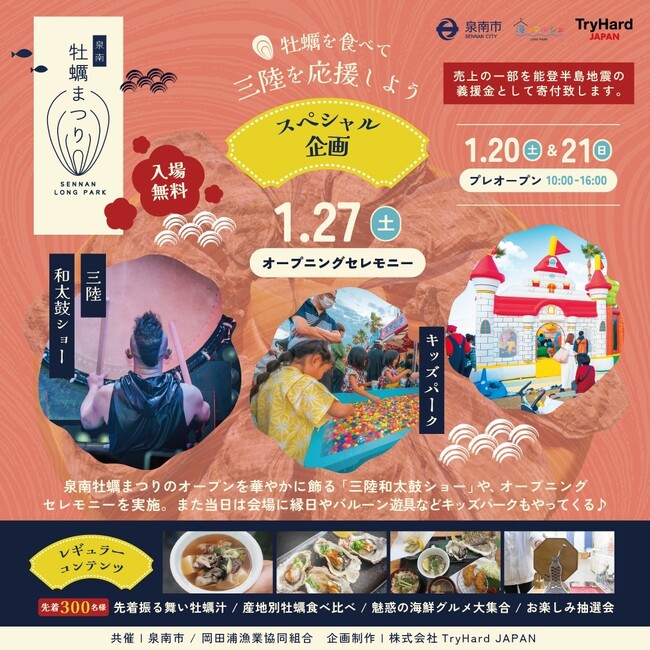当日は三陸和太鼓ショーや来賓を招いてのオープニングセレモニーをはじめ、先着300名限定「振る舞い牡蠣汁」の無料提供、三陸や泉南の特産物が当たる「お楽しみ抽選会」、牡蠣を存分に堪能できる「泉南スペシャル牡蠣定食」をはじめとした牡蠣グルメや、お子様にもお楽しみ頂けるキッズパークなど、楽しくて美味しいスペシャル企画をお届けいたします!