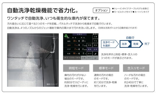 - 自動洗浄乾燥機能も搭載し、衛生面での安心とメンテナンスの手間を軽減します。