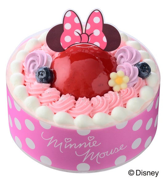 「<ミニーマウス>デコレーション」は、ベリームースや苺の甘ずっぱさに、まろやかなチョコガナッシュがアクセント。別添えのピックでミニーマウスのドレスアップが楽しめます。 「<ミニーマウス>苺のレアチーズ」は、苺&ラズベリーの甘ずっぱさとチーズムースのまろやかさが心地いいケーキ。