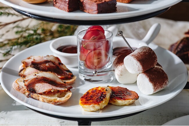 また下段のセイボリーには、ショコラバルサミコソースで仕上げた合鴨のカナッペのほか、ぶどう、マシュマロやキャラメリゼしたバナナをスイートチョコレートにディップしてお召し上がりいただく、プチチョコレートフォンデュをご用意しました!