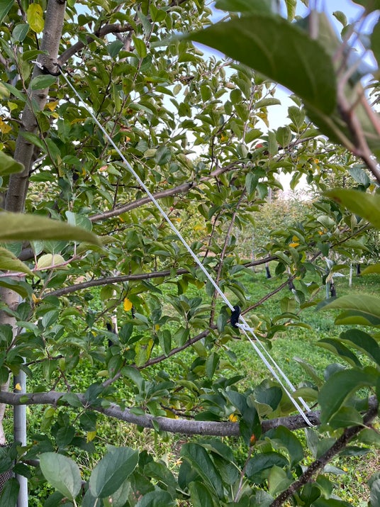 農園:果樹の枝吊りによる枝の保護、誘引、整枝による果樹の育成