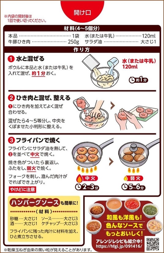 ●料理初心者の方でも簡単に作れるのが特徴で、大豆たんぱくが入っているので、まぜる時にひき肉が手につきにくく、焼き崩れにくくなっています。