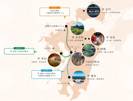 以前より星野リゾートでは、源泉数と温泉湧出量日本一の豊富な温泉資源、活発な火山活動によって形成された世界有数の巨大カルデラ、天孫降臨にまつわる神話とそれを連想せずにはいられない神秘的な自然環境、さらに豊富な食材やそぞろ歩きを楽しめる街など、国内の他の場所と異なる魅力を持ち豊富な観光資源がある九州に注目し、様々なブランドを展開してまいりました。各エリアの魅力を点で楽しむだけではなく「周遊旅」をテーマに旅を提案することで、九州全域を楽しむ旅の促進をしたいという思いから、さまざまなニーズに合わせた体験をご用意しています。