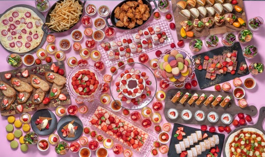 また、スイーツだけでなくピッツァや鶏の唐揚げ、ミニバーガー、ポテトフライなどのフードメニューも豊富にご用意。“苺尽くし”な心ときめくスウィートな時間を心ゆくまでご堪能ください。