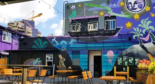 カカアコの直営パブのガーデンには、色鮮やかなウォールアートが描かれています。