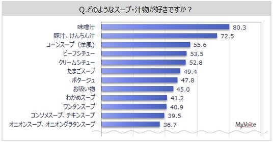 ■好きなスープ・汁物は「味噌汁」「豚汁、けんちん汁」が7~8割、「コーンスープ(洋風)」「ビーフシチュー」「クリームシチュー」が各50%台